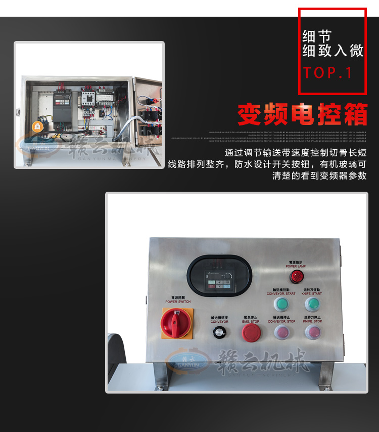 GY-SZKP-120A砍排機,優質刀片。通過調節輸送帶速度控制切骨長短線路排列整齊,防水設計開關按鈕,有機玻璃可清楚的看到變頻器參數。壓菜帶根據不同的需求調節不同的高度,輸送帶采用PVC材質,可拆卸更換輸送帶,拆卸方便。優質刀片,杜絕卷刃。機身背面散熱孔設計,電機運作時散發熱量,散熱孔設計更有效的保護電機的壽命,出料口傳感器設計,機器運作時打開刀盤門機器停止運作,安全穩定,人性化設計。